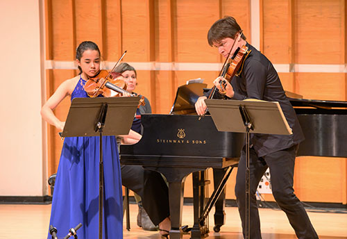 Three outstanding young SMS violinists – Rebecca Beato (8th grade, student of Viktor Basis), Ana Isabella España (8th grade, student of Lynelle Smith; pictured above) and Julia Jones (SMS alumna, student of Viktor Basis) – joined Mr. Bell on stage for performances of movements from Bach's Concerto in D minor for Two Violins. Mr. Bell, an SMS parent, and Mr. Bax performed works by Franck, Schubert, Wieniawski and Chopin. The audience at this sold-out performance included 200 SMS students as well as several hundred generous supporters of the school.